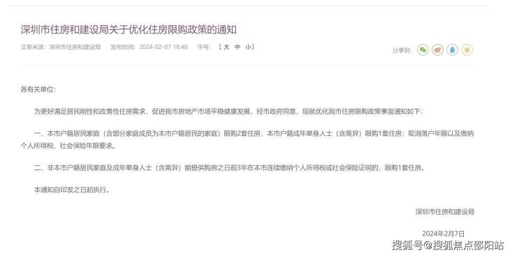 2月7日,深圳市住房和建设局发布关于优化住房限购政策的通知,本市户籍居民家庭(含部分家庭成员为本市户籍居民的家庭)限购2套住房,本市户籍成年单身人士(含离异)限购1套住房;取消落户年限以及缴纳个人所得税、社会保险年限要求。