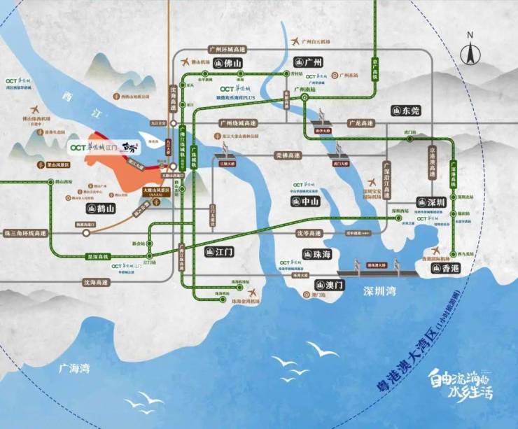 地處大灣區樞紐腹地,占盡承東啟西區位優勢,對接廣佛都市圈、深港經濟圈兩大龍頭,構成粵港澳大灣區“黃金三角地帶”。未來依託江門市6條軌道路線、8處規劃機場、4處客運樞紐及7個沿海港區的水陸空立體交通佈局,輻射珠三角高端圈層。
