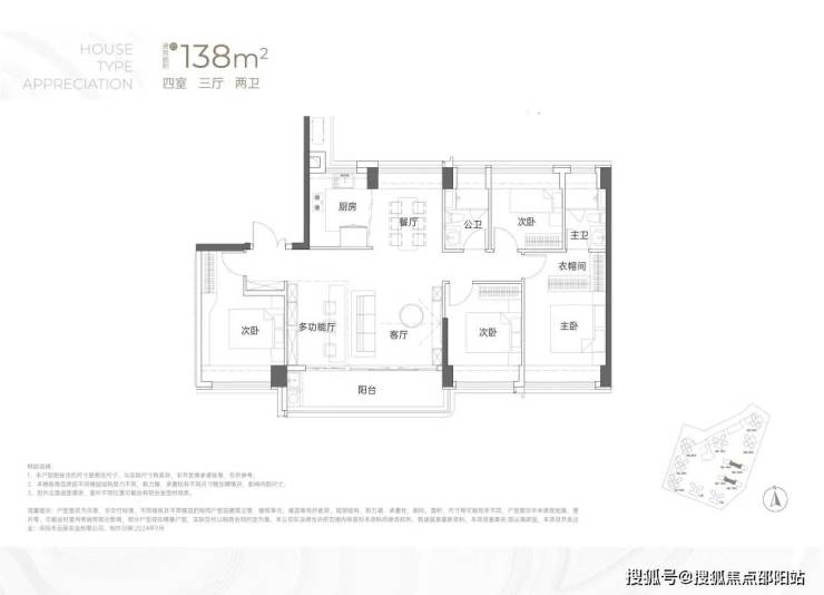 竖庭格局,西南向,基本居住功能与建面约108-110㎡4房2卫一致,但格局不一样,从目前公布的户型图上看,主要是主卧空间有了更大的提升,比如可以放更大一点的衣柜。但从位置上看,它所在的楼栋更靠近主干道,会有噪音影响。