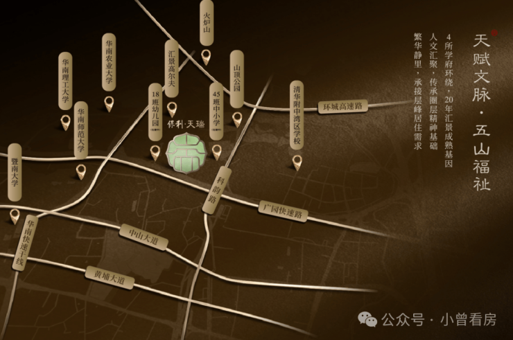 项目位于天河五山汇景新城板块内,珠江新城和琶洲金融城两中轴间的核心位置,楼盘身后就是汇景20年醇熟的圈层配套