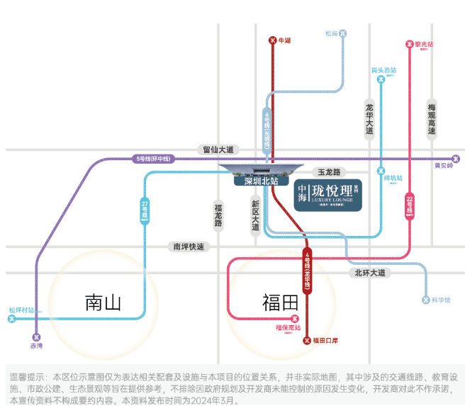 项目距离深圳北站约500米,坐享深圳北站总部基地红利,承接来自港澳、湾区乃至全国的人潮,多线汇集带来人潮流入与财富聚集。