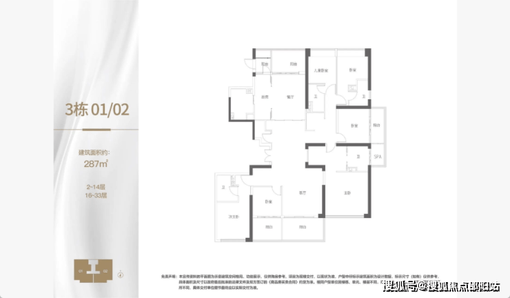 三栋楼王建面约287㎡,三梯两户,最高36层,层高3.15m