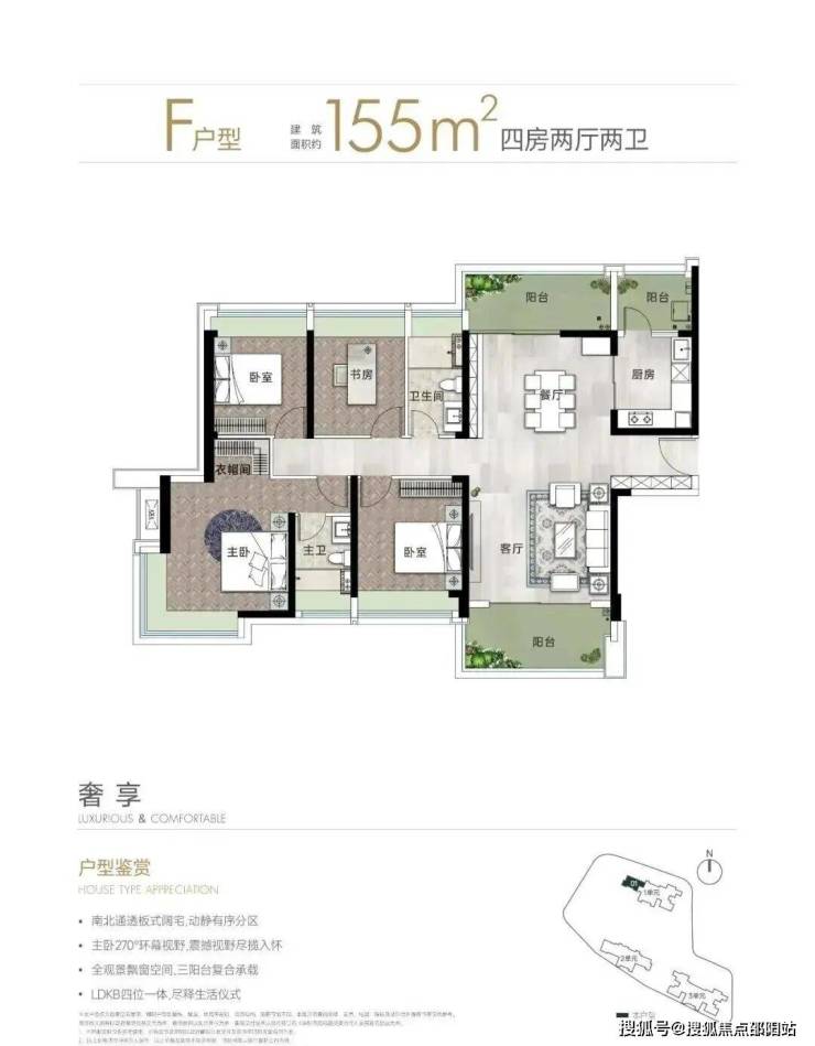 155㎡的4房2厅2卫,F户型,设计的是竖厅南北通透格局,双阳台,进门入户玄关,LDKB一体化设计,动静分区,四开间朝南,L型厨房还带1个小生活阳台,卫生间干湿分离,得房率约78.72%(不含赠送),客厅阳台主朝西南向。