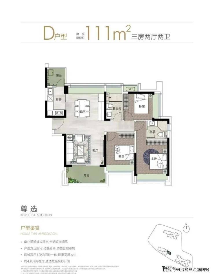 111㎡的3房2厅2卫,仅1栋2单元D户型,设计的是竖厅南北通透格局,板楼设计,客厅4米开间,LDKB一体化设计,三开间朝南,3个卧室分别做到了主卧13.88㎡/次卧11.1㎡/次卧9.99㎡(包含墙体飘窗),L型厨房还带1个小生活阳台,卫生间干湿分离,得房率约78.83%(不含赠送),西南朝向。