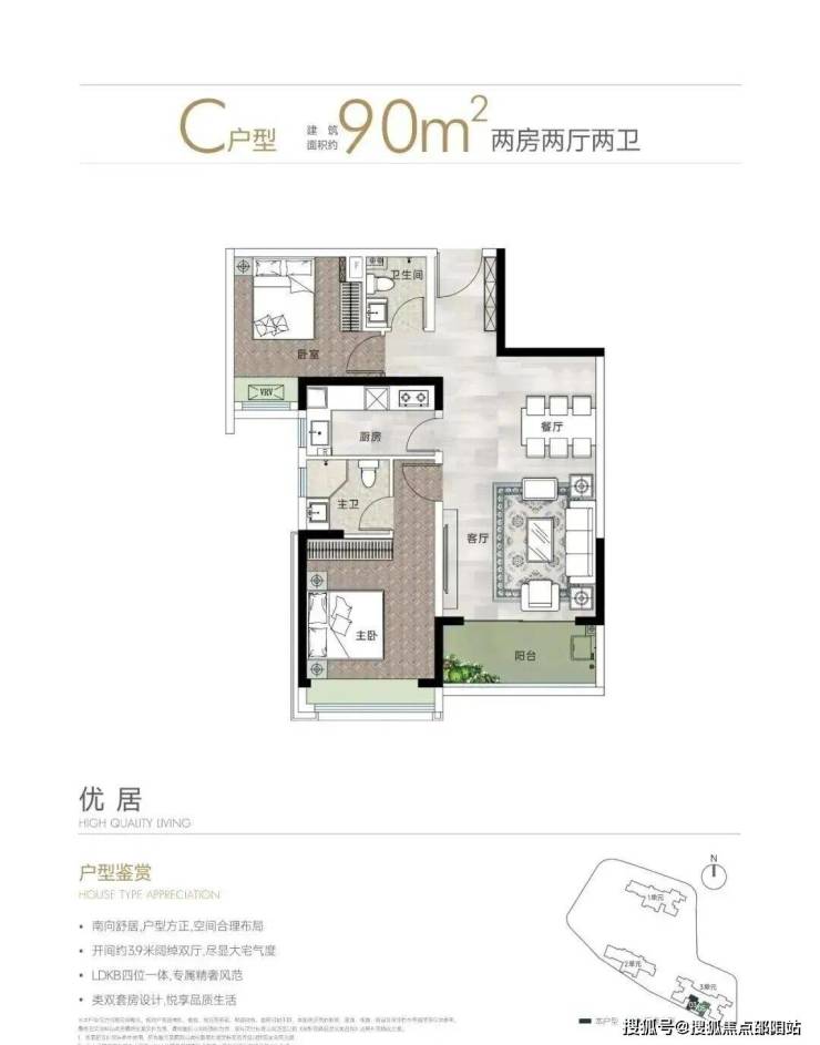 90㎡的2房2厅2卫,设计的是竖厅格局,进门入户玄关,客厅3.9米开间,LDKB一体化设计,2个卧室分别做到了主卧13.86㎡/次卧10.23㎡(包含墙体飘窗),L型厨房,卫生间干湿分离,得房率约79.24%(不含赠送),西南朝向。