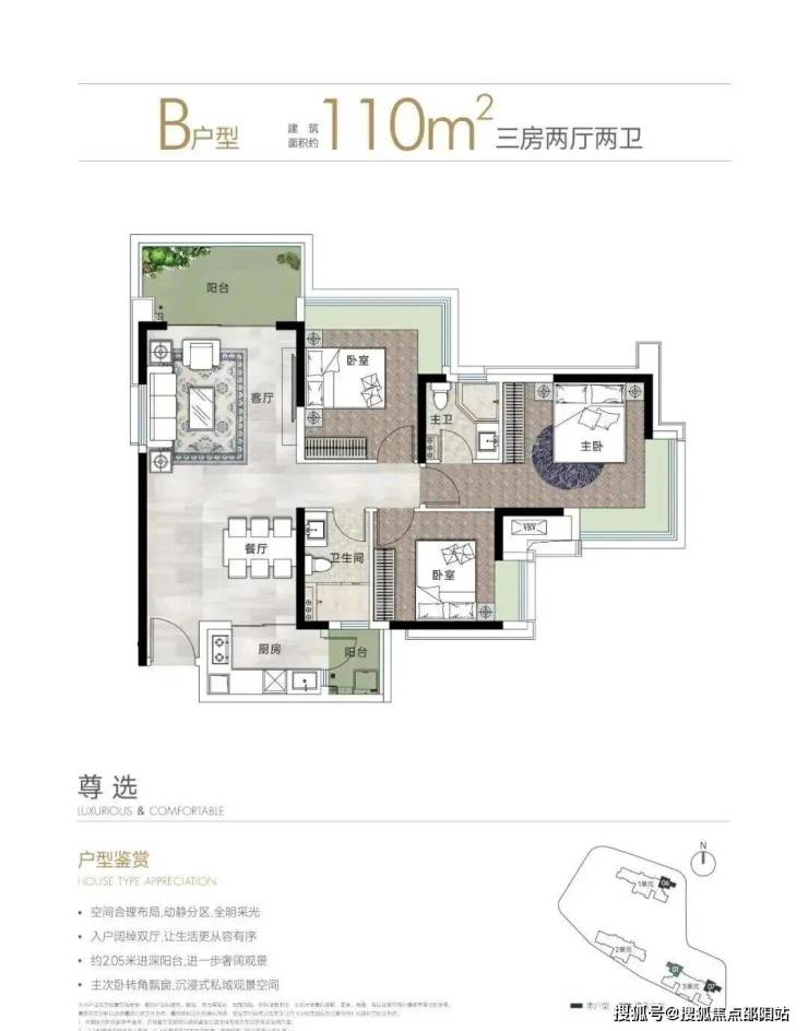 110㎡的3房2厅2卫,B户型,设计的是竖厅南北通透格局,进门入户玄关,客厅3.9米开间,LDKB一体化设计,动静分区,3个卧室分别做到了主卧16㎡/次卧12.3㎡/次卧9.56㎡(包含墙体飘窗),L型厨房还带1个小生活阳台,卫生间干湿分离,得房率约79.24%(不含赠送),东北朝向。