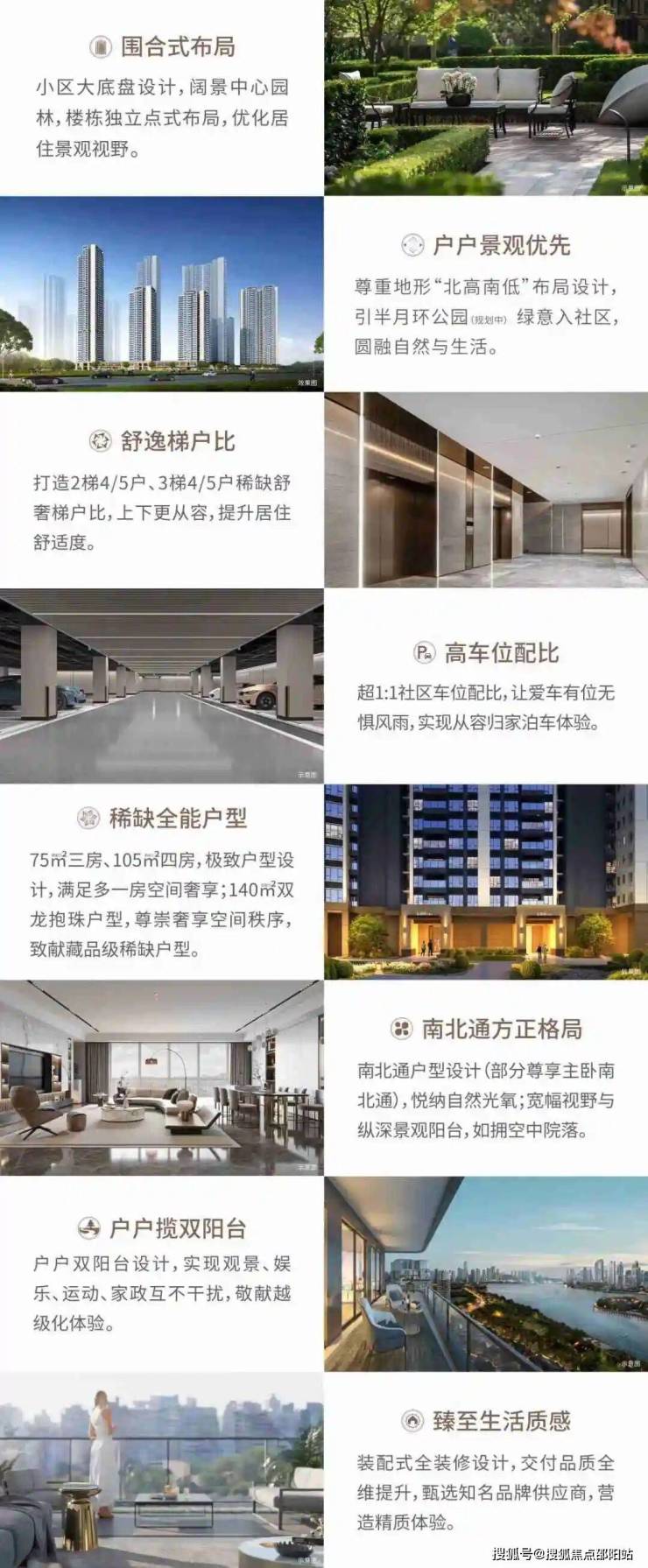 【建筑协奏曲 空间诗学】◎天际线韵律:建筑群采用"北高南低"的错落布局,如音符般起伏的天际线,既确保每户享有充沛日照,又将半月环公园的盎然绿意尽收眼底。54层的巅峰高度,成就俯瞰城市盛景的视觉盛宴。◎立面光影诗:建筑外立面以现代主义手法演绎,流畅的横向线条与精致的竖向分割相得益彰,在阳光下勾勒出变幻的光影画卷。玻璃幕墙与金属饰面的巧妙组合,在昼夜交替间演绎出现代都市的韵律之美。◎园林意境图:35%绿化率营造出层层递进的立体园林,以"一轴三园九景"的布局,将阅读花园、亲子乐园、健身空间等全龄场景有机串联。风雨连廊如飘逸的丝带,将建筑与景观温柔相接。◎归家礼仪篇:2梯4-5户的舒奢配置与超1:1车位配比,让归家之路始终从容。地下车库采用环氧磨石地坪与艺术照明系统,以酒店式体验重塑归家仪典。