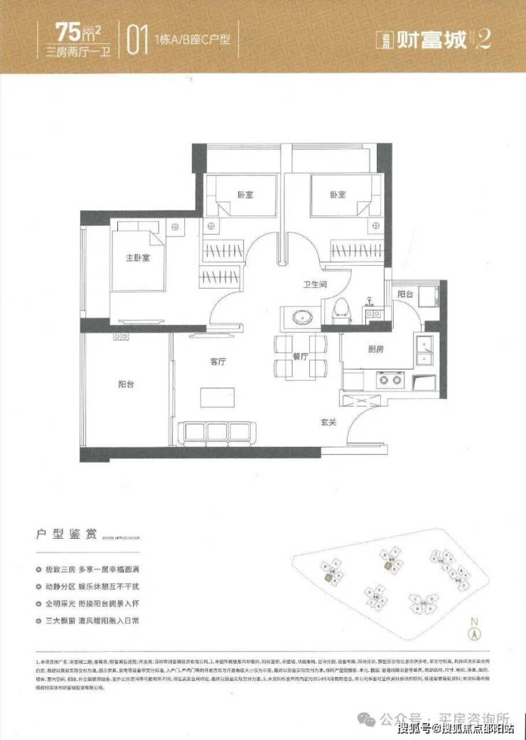 【户型交响诗 空间魔术】◎75㎡三房:3.05米客厅开间配以三卧室科学布局,L型厨房与三段式卫浴巧妙衔接,在有限空间内创造无限可能。