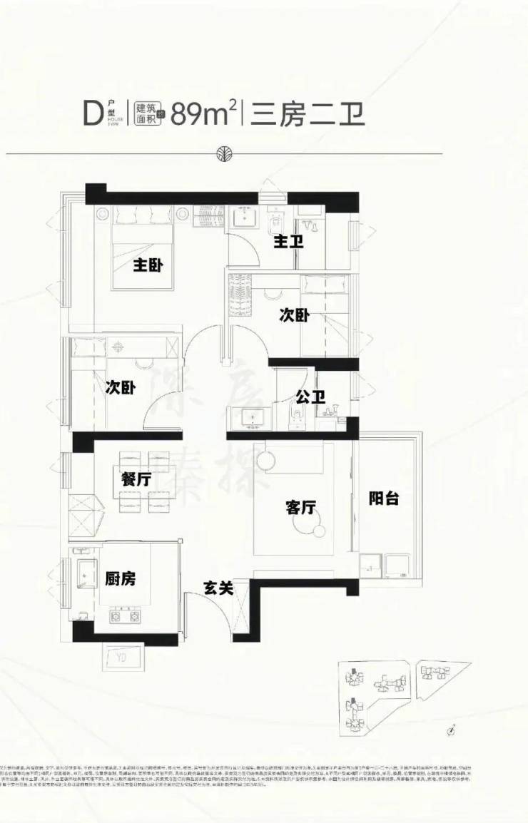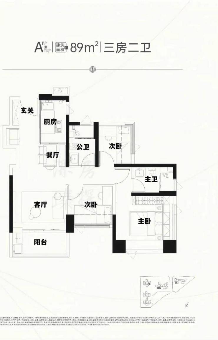 89㎡的3房2厅2卫,A户型,设计的是经典竖厅格局,客厅实测3.19米开间,LDKB一体化,S墙设计预留冰箱卡槽位,动静分区,3个卧室分别做到了主卧11.96㎡/次卧5.96㎡/次卧5.85㎡(去掉墙体,实测面积),L型厨房,卫生间干湿分离,东南或东北朝向。