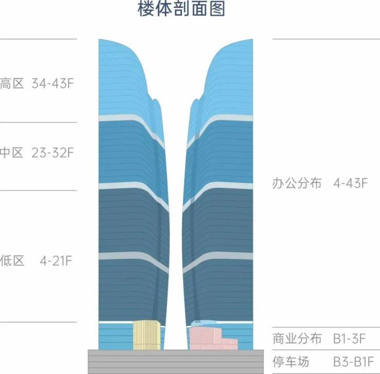 高区34-43层:共10层面积约2.3万㎡(整层2300㎡)