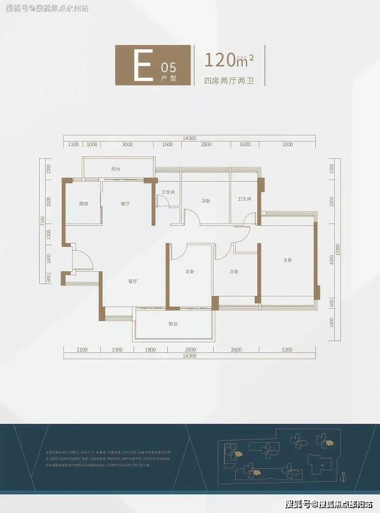 E-05户型为120㎡4房2厅2卫:该户型与G-05相似,南北通透,客餐厅独立,双阳台,多飘窗