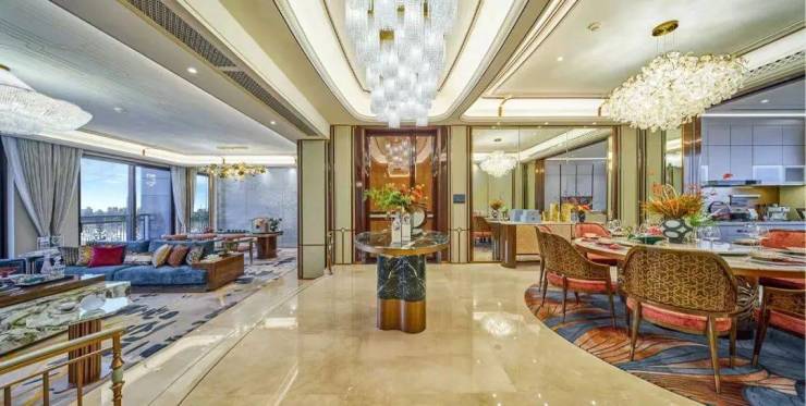 项目主推建面236-1604㎡的江景大平层,涵盖四房至五房配置,以“九宫格宫殿格局”和“十字中轴中庭设计”重新定义空间美学: