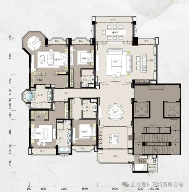 :五房三厅五卫带工人套房,6米开间跃式客厅、宫廷八角窗设计,层高3.47-3.57米,彰显大宅仪式感。