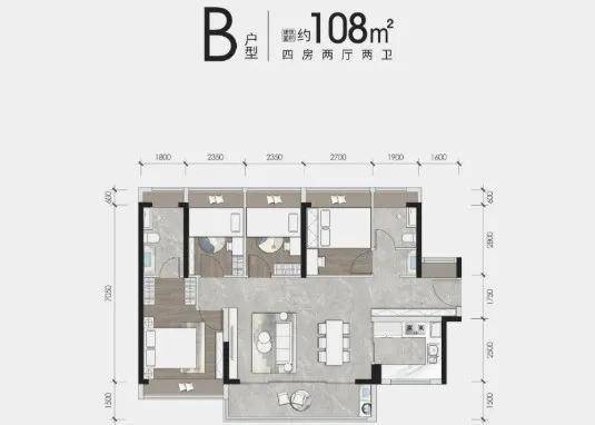 108㎡户型:横厅设计,使得客厅显得更宽,通透性更好,四房两厅一厨两卫一阳台的布局,适合家庭居住。