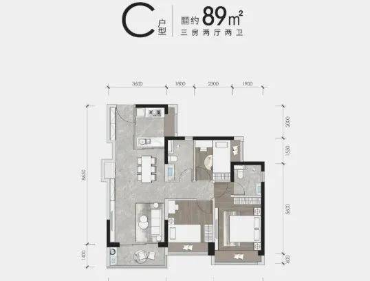 89㎡户型:传统的竖厅设计,动静分区明确,三房两厅一厨两卫一阳台的布局合理,虽然无明显亮点,但也没有明显的缺点。