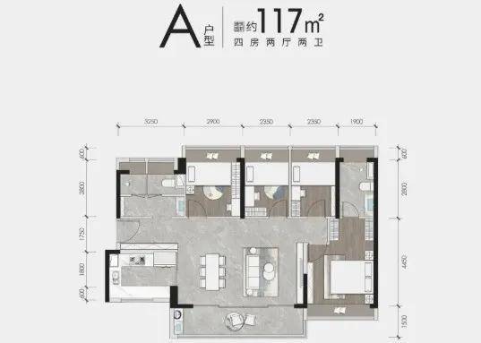 117㎡户型:大致上与108㎡户型相似,但各功能间面积稍大,入户的厨房和卫生间也更加宽敞,通透性更佳。