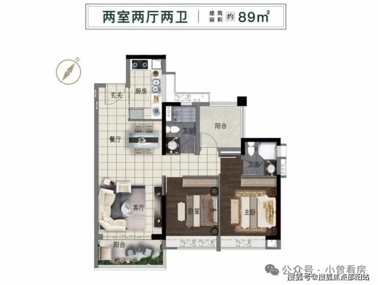 89㎡户型三开间朝南,南向望园林,独享阳光景观,主卧套房设计,更具私密性。