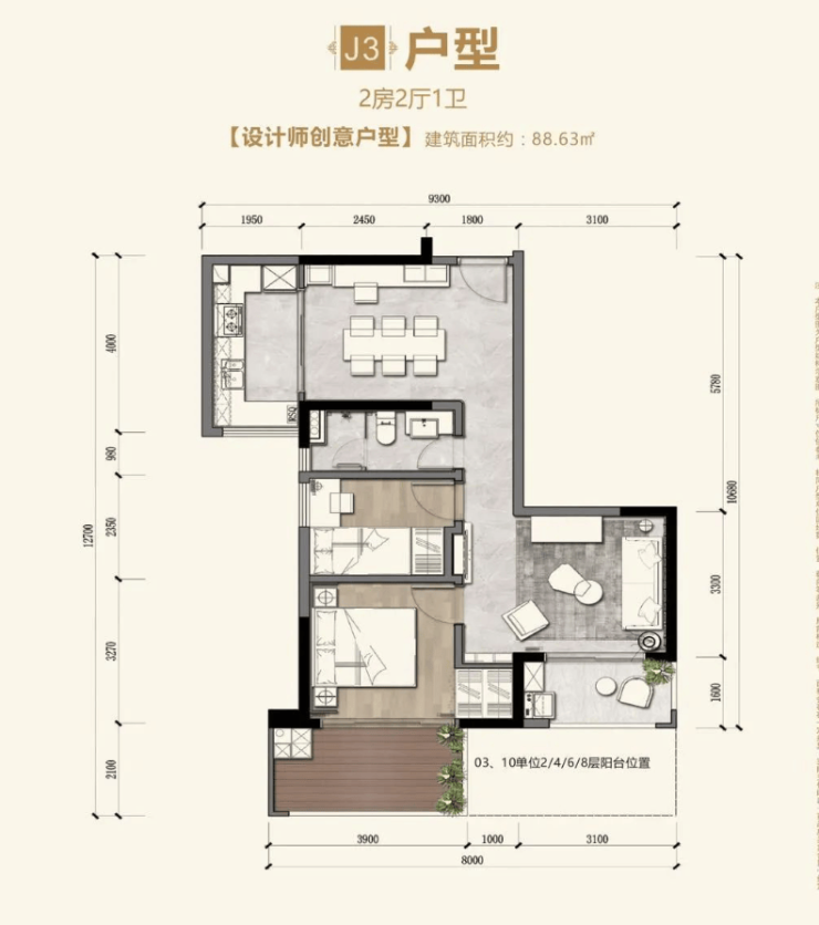 J3户型【88.63㎡】2房2厅1卫