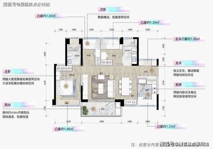 【建面约112㎡四房两厅两卫】南向户型,南北通透,奢阔客厅,休息娱乐,即享舒适,客厅直连约4.6m阔景阳台,推门见美景,舒雅套房,南向飘窗,全明通风采光。