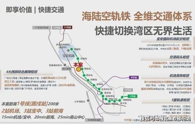 项目步行约200米就是1号线固戍站。(来源:百度地图测距)由此出发,约2站可达深圳机场、约4站可达宝安中心、6站可达前海核心区,还可快速通达机场福永码头、大铲湾码头。