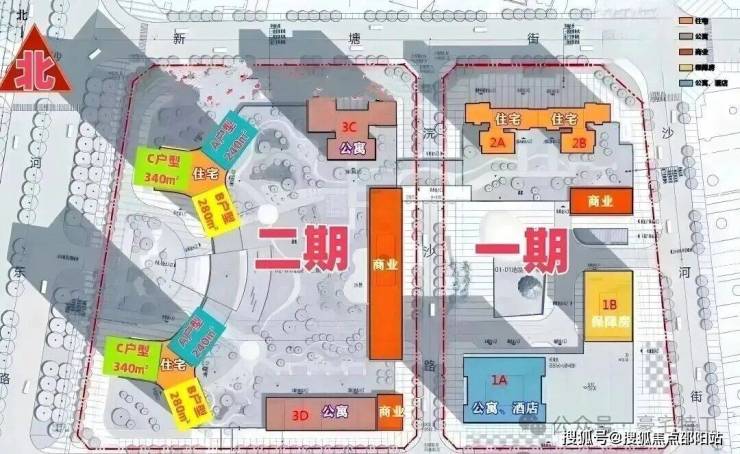 整个项目分两期开发建设,其中:项目一期东地块包含1栋酒店+商务公寓、1栋保障房、2栋包含一、二单元的住宅;西地块包含2栋高约250米的超高层住宅,另有1栋约50层高的商务公寓。