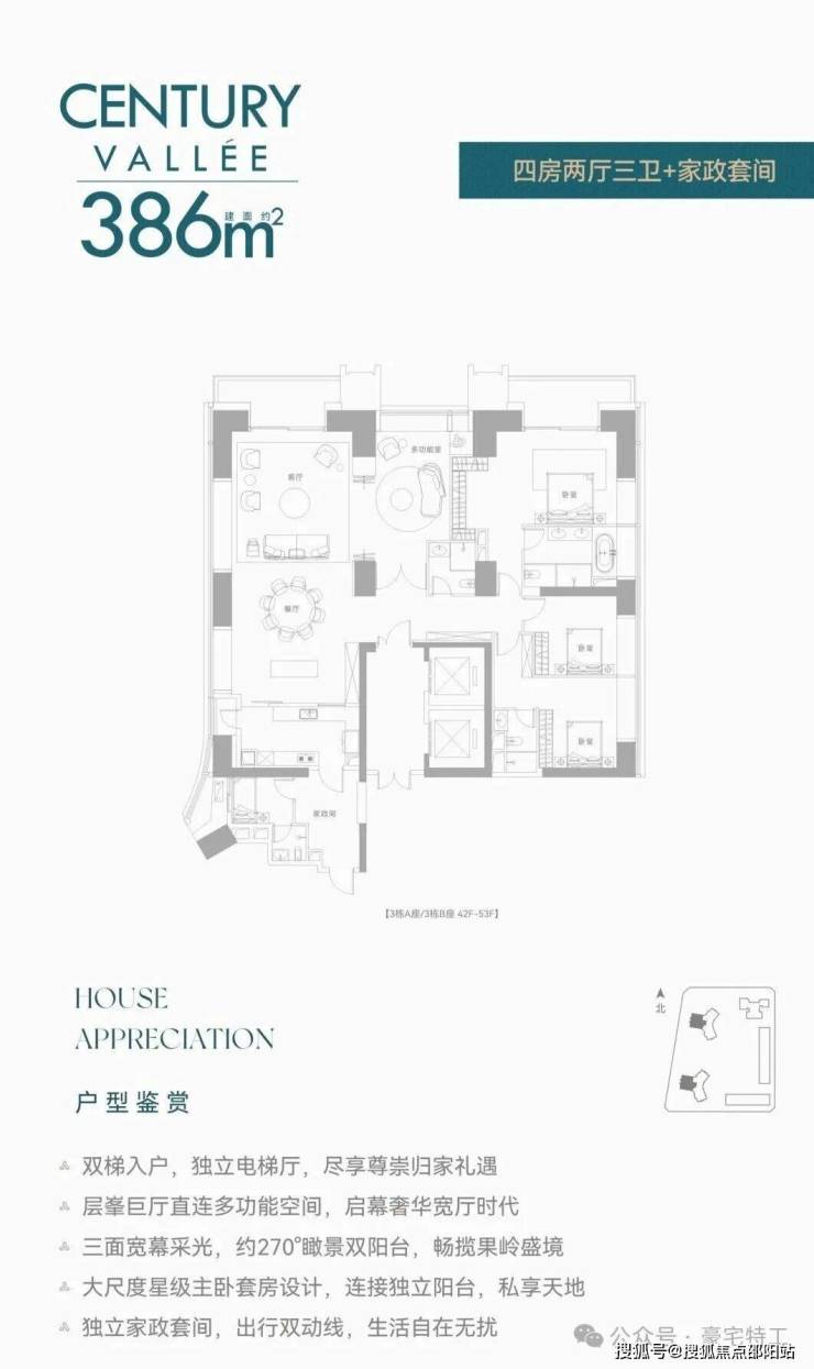 【约386㎡4+1房4卫】双梯入户,独立电梯厅,阔绰横厅直连多功能空间,三面舒适采光,主次卧双套房,270°环幕视野,还有独立家政套间,西朝向看名商高尔夫和大河沙生态长廊。