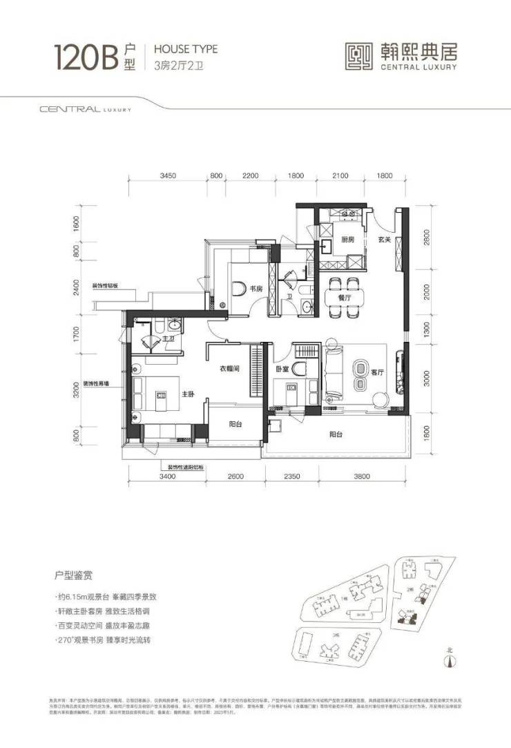 120㎡B户型:位于三单元05梯腿、四单元01、02、05梯腿,朝东朝南都有分布,3+1房2卫,主卧面积达30多㎡,主卧一侧的衣帽间+阳台进深1.6米,开间4米多,可改+1房。不过阳台开间约6.15米,没有105㎡户型有优势。