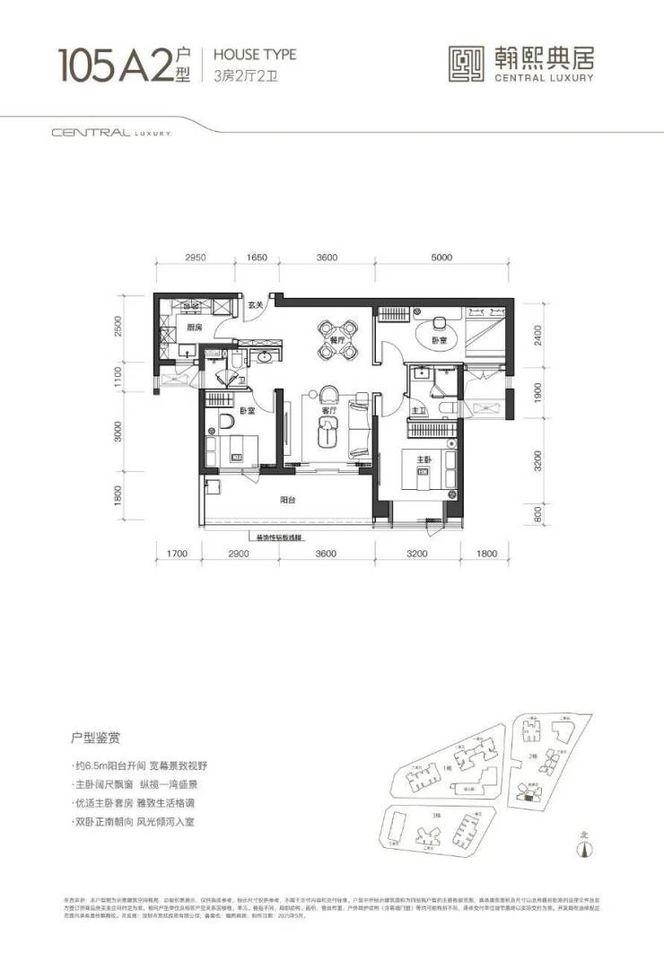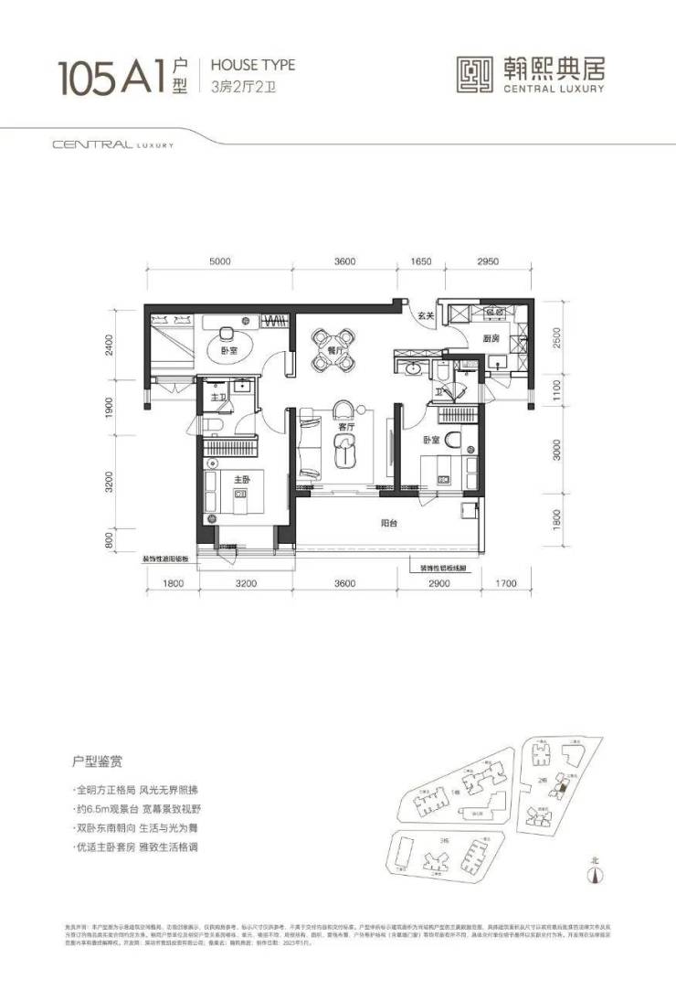 105㎡A1户型:位于三单元03梯腿,3房2卫、典型的双龙抱珠格局、入户带玄关,朝东向,阳台开间6.5米,客餐厅面积约23㎡,主卧套房约16㎡,主客卧分开私密性好。