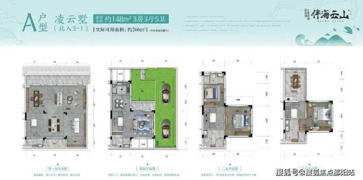 凌云墅A户型(北入户)建筑面积约148㎡,实际可用面积约266㎡(不计花园及露台)