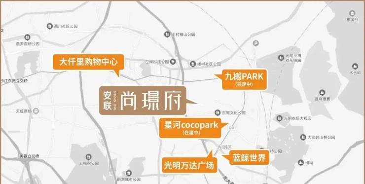 🛍 🛍 项目周边商业配套面积超过15万㎡,如光明广场、大仟里购物中心、万达广场、天虹商场等多所商场环绕,竭力满足生活所需