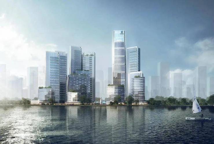 项目一线临江,搭配现代商务全玻璃幕墙,南高北低,最大程度展现一线江景。