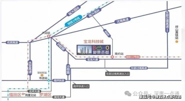 项目直连地铁 14 号线 南约地铁口(规划中 31 号23 号线),2 站大运、9 站福田中心,未来可享四地铁交汇利好;沈海高速和东部过境高速南北贯穿直通罗湖,无缝连接福田、南山;坐享地铁、铁路交通、公交枢纽等多维交通体系,快速通达深圳中心城区、香港及周边城市,高效链接都会生活圈。