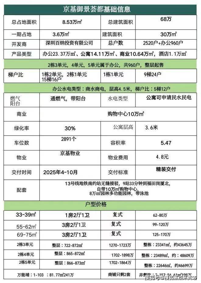 京基御景荟都分三期开发,一期是由4栋总层42-44层的公寓和3栋办公组成,一期建面30万㎡,二期三期是由学校,酒店,办公,公寓组成。目前在售一期产品