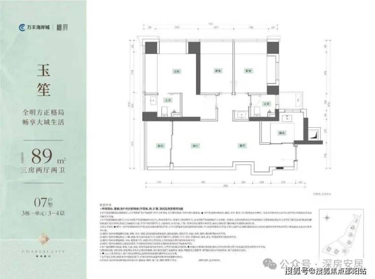 89㎡的3房2厅2卫,设计的是竖厅南北通透格局,客厅3.35米开间,餐客厅分离设计,四开间朝南,U型厨房,卫生间干湿分离,主朝西南向。