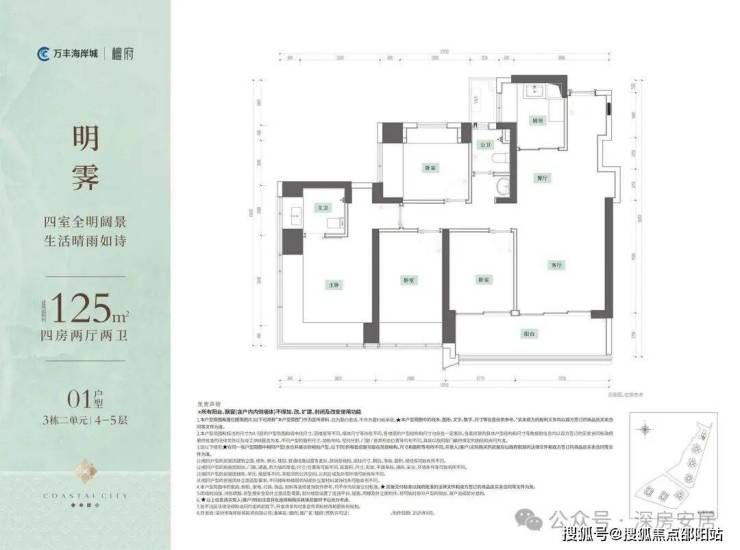 这次首推的万丰海岸城檀府A313-1568地块,总占地面积约1.89万㎡,总建筑面积约17.95万㎡,计容建筑面积约12.87万㎡,容积率6.79,绿化率40%,共由4栋45-47层高的住宅组成,其中2栋1单元住宅47F,2栋2单元住宅45F,3栋1单元住宅45F,3栋2单元住宅46F,4栋是1所12班制幼儿园。
