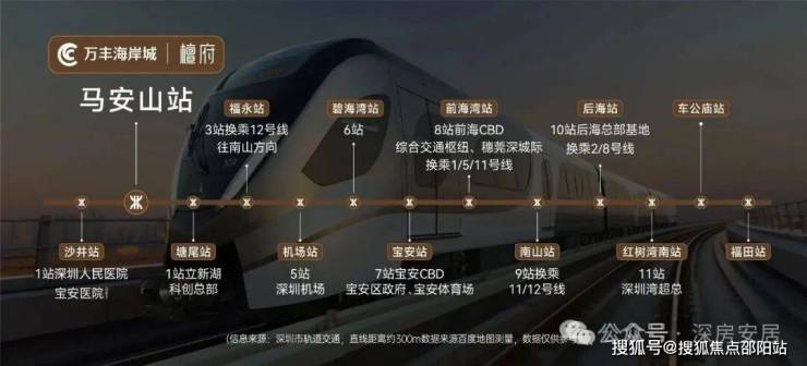 铁配套:万丰海岸城檀府的交通配套极为便捷,形成了"地铁+公交+自驾"三位一体的立体交通网络。地铁方面,项目距离11号线马安山站直线距离约300-600米,步行3-5分钟可达,该站设有D出口直接连接项目,且站内设有母婴室、无障碍通道等人性化设施。11号线可与深圳地铁1号、2号、3号、5号、6号、7号、9号、12号等8条线路直接换乘,半小时可达宝安机场,40分钟可到南山科技园,50分钟可达福田中心。
