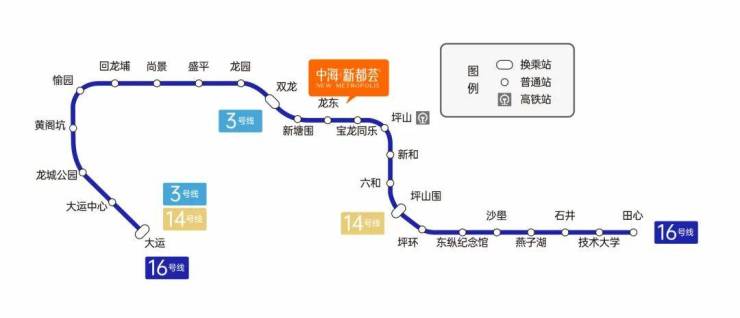 地铁配套:中海新都荟,家门口就是16号地铁线“龙东站”,该线路是起自坪山田心,开往龙岗大运枢纽的普线,2站可到坪山高铁站,11站到大运站可换乘3/14号线。
