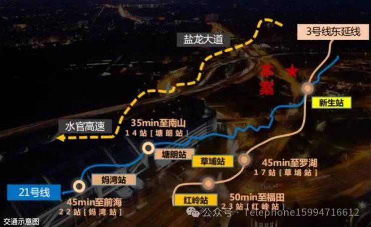 交通配套:项目靠近在建的地铁3号线东延线坪西站,直线距离约一公里,周边还有规划中的21号线,未来交通将更加便捷。同时,项目毗邻盐龙大道,可快速接驳水官、外环等高速,大约30分钟到罗湖、35分钟到福田。