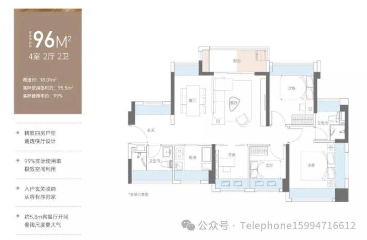 96㎡四房两厅两卫:大横厅设计,南北通透,餐客厅、阳台一体,没有浪费的空间。每个空间都有飘窗,包括餐厅和玄关,主卧双飘窗设计且双向对流。
