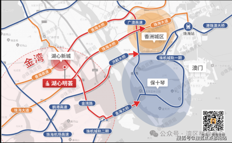 湖心明荟雄踞西部交通枢纽核心:湖心路、双湖路双主轴连通南北,珠海大桥、香海大桥(2022年已正式通车)、洪鹤大桥横跨东西,斗门至香洲实现约15分钟高效通勤,约30分钟达横琴通关澳门、约35分钟到港珠澳大桥人工岛。
