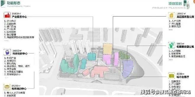 规划功能区:①创业集群:办公基地;②人才公寓:菁英住区;③城市展厅:事业窗口;④国际学校:人才摇篮;⑤园林会客厅:交流平台。