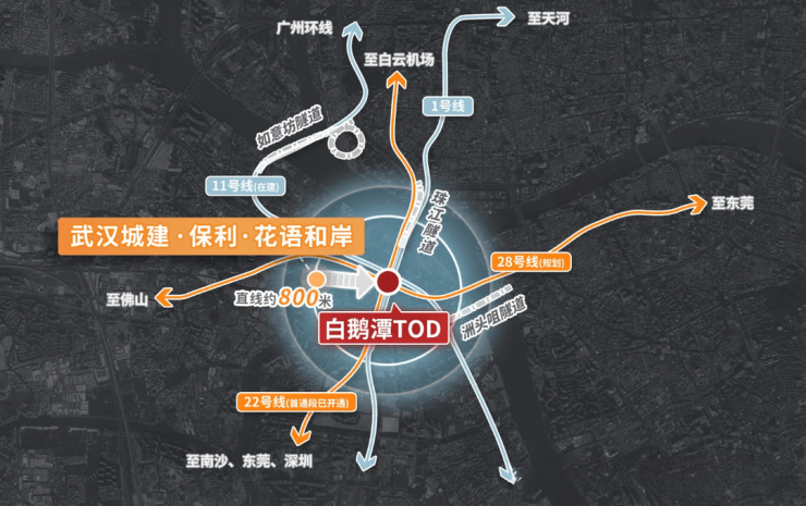 步行约800米可到1号线芳村站,四线合一超级枢纽(包含1号线已开通,11号线已开通/22号线建设中,28号线规划中),轻松链接全城,未来0换乘直达广州站、广州南站、白云机场等重要交通枢纽。