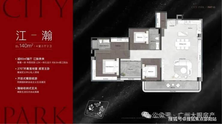 该栋为25层高,两梯三户设计,只有两个面积段,120㎡和140㎡,户型做得不错,在景观展现上用了功,极大程度去放大观江面,比方说超宽阳台、L型主卧转角飘窗、客厅预留观景飘窗等等,主打改善户型,2025年9月整体交房