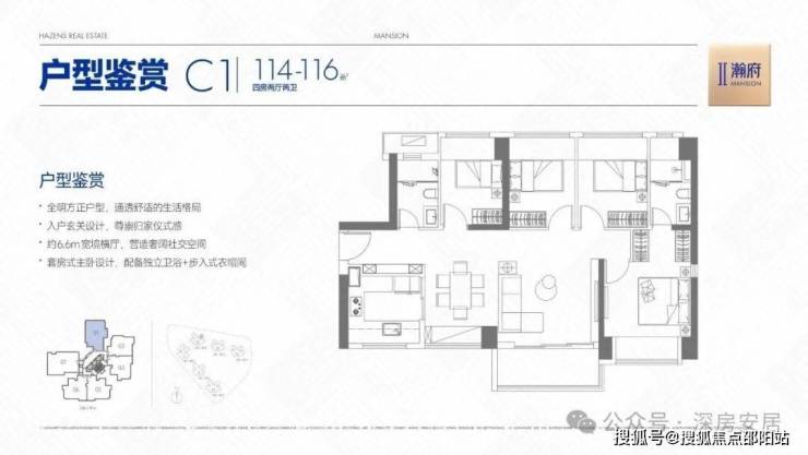 114-116㎡4房2厅2卫01(C1)户型,设计的是横厅朝东南向,客餐厅开间6.6米,LDKB一体化设计,四开间朝南,全屋7面飘窗,主卧套房+步入式衣帽间,3个次卧朝西北向。