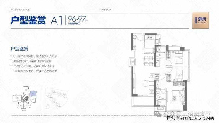 96-97㎡3房2厅2卫02(A1)户型,设计的是竖厅两个半开间朝东南,客厅开间3.5米,LDKB一体化,S墙设计预留冰箱卡槽位,动静分区,次卧东北向。