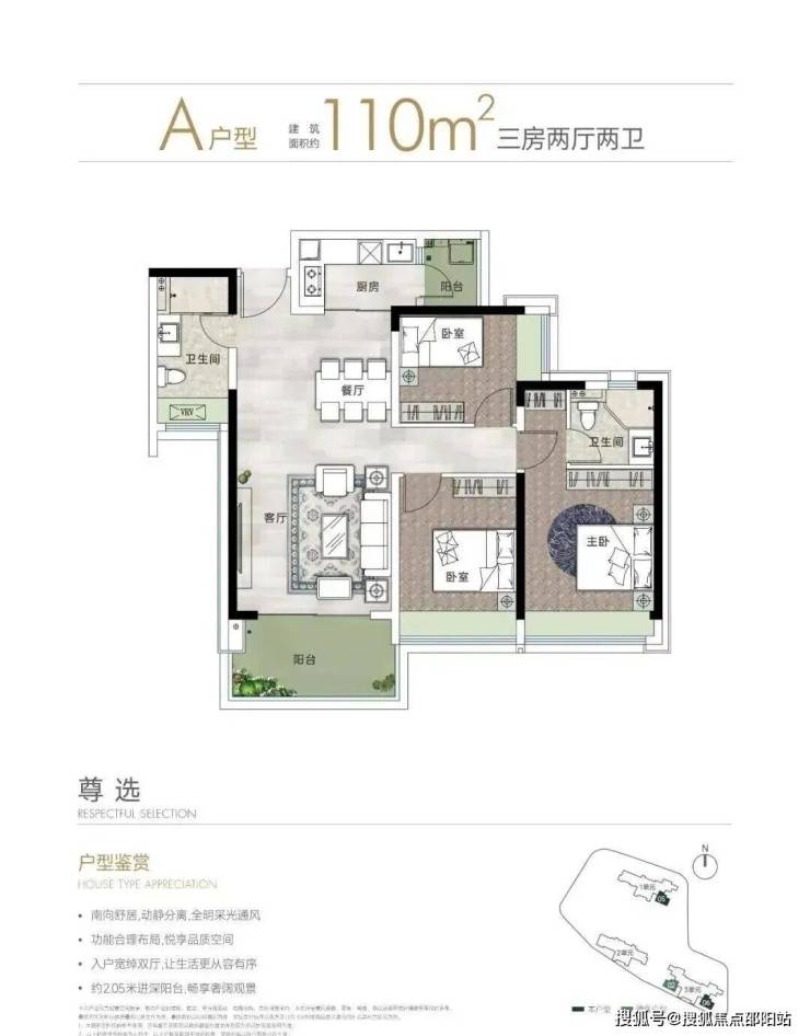 110㎡的3房2厅2卫,A户型,设计的是竖厅格局,客厅3.9米开间,LDKB一体化设计,三开间朝南,3个卧室分别做到了主卧15.95㎡/次卧12.6㎡/次卧9.18㎡(包含墙体飘窗),L型厨房还带1个小生活阳台,卫生间干湿分离,得房率约79.24%(不含赠送),阳台进深2.05米,西南向。