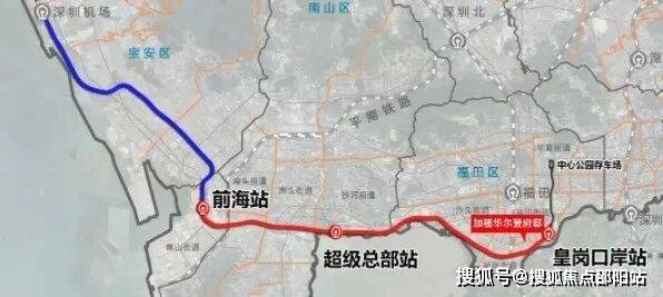 穗莞深城际(建设中)延长线——穗莞深城际前海至皇岗口岸段设有皇岗口岸站,途径南山、福田等地,建成通车后2站到前海,1站到深圳湾总部基地。