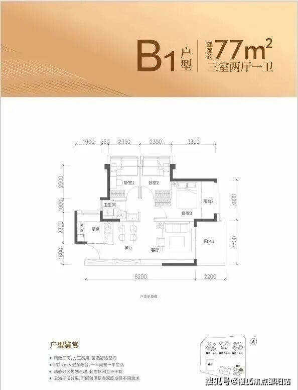 特点:LDKB一体化设计,主卧13.24㎡(含飘窗),次卧8.85㎡(含飘窗),次卧6.75㎡(含飘窗)。