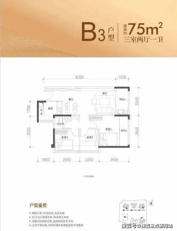 特点:LDKB一体化设计,主卧11.3㎡(含飘窗),次卧7.28㎡(含飘窗)x2。