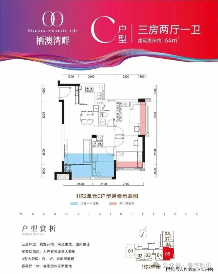 🔺C户型:建筑面积约64㎡,创意三居,采光/动线都在线